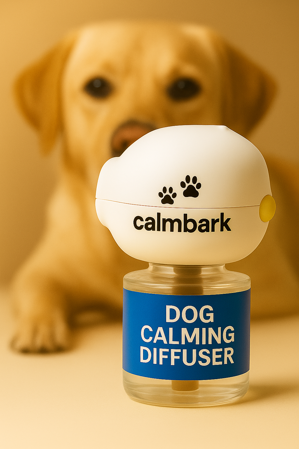 A calming diffuser releases natural, pet-safe essential oils or pheromones into the air that help reduce stress, anxiety, and excessive barking in dogs.
